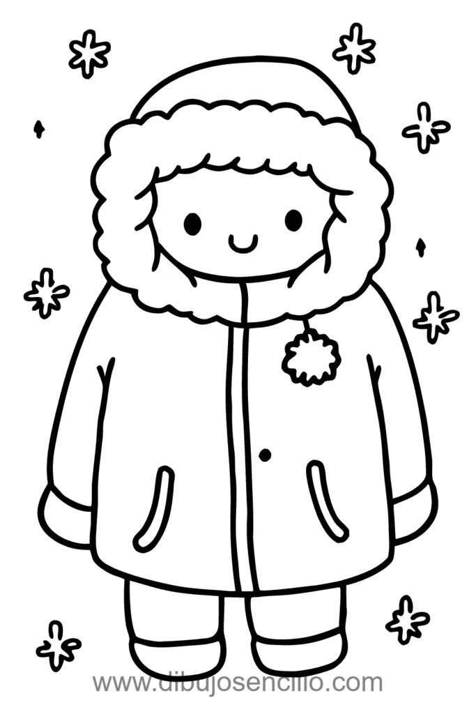Un abrigo de invierno abrigado y acolchado con capucha forrada de piel, cierre y bolsillos para protección del frío. Los copos de nieve cayendo y bufanda envuelta alrededor crean atmósfera de invierno completa helada. Los mitones y botas junto con chocolate caliente representan todo lo necesario para enfrentar temperaturas bajas cómodamente.