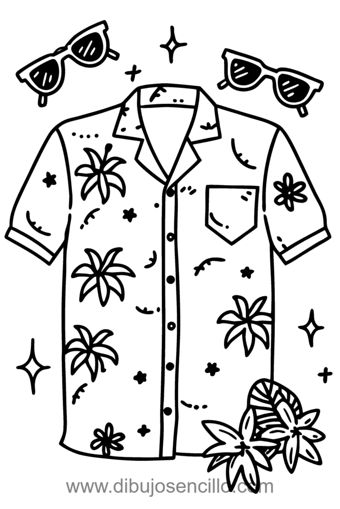 El estilo de caricatura con colores tropicales brillantes hace que esta camisa sea festiva y veraniega. Es ideal para practicar patrones complejos y crear moda que transmita sensación de destino o estado de ánimo.