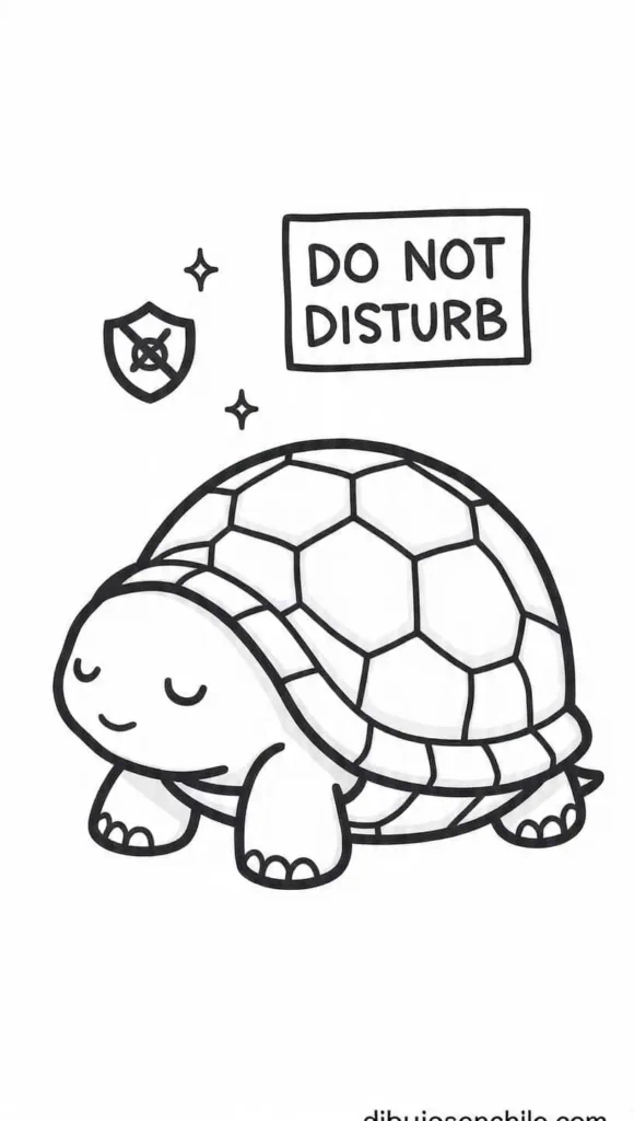 El estilo kawaii con privacidad respetada hace que esta tortuga sea relatable para introvertidos. Es perfecto para representar necesidad de espacio personal y celebrar mecanismos de autoprotección saludables naturales.