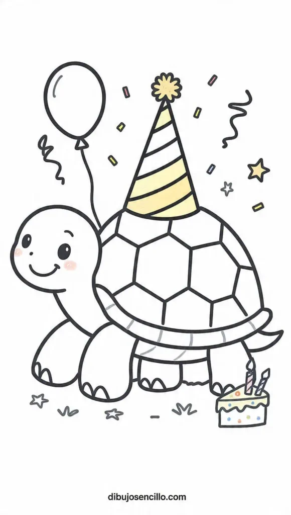 Una tortuga feliz con sombrero de fiesta colorido sobre el caparazón mostrando expresión celebratoria festiva. Los globos atados al caparazón y confeti crean atmósfera de cumpleaños alegre completa. El pedazo de pastel y matracas enfatizan que incluso las criaturas más lentas merecen celebraciones grandes emocionantes.