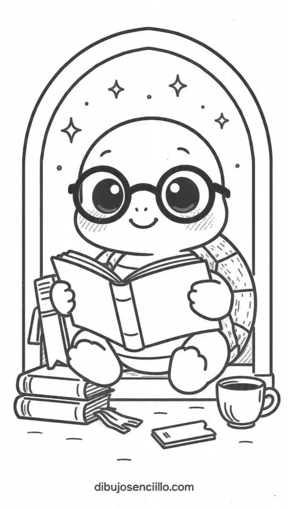 Una tortuga usando lentes de lectura sosteniendo libro abierto con aletas mostrando expresión concentrada estudiosa. La pila de libros y taza de té crean rincón de lectura acogedor perfecto para aprender. El marcador y lugar cómodo de lectura sugieren que las tortugas sabias dedican su larga vida a acumular conocimiento pacientemente.