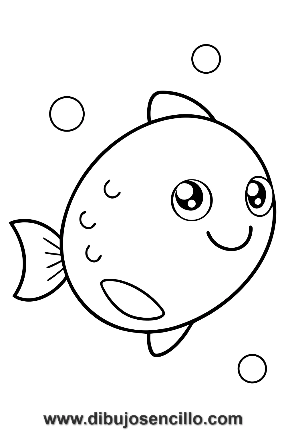 Un pez kawaii con ojos brillantes y una sonrisita adorable nadando tranquilamente entre sus propias burbujas. Su cuerpo ovalado y sus aletas simples lo hacen uno de los dibujos marinos más fáciles y encantadores de lograr.