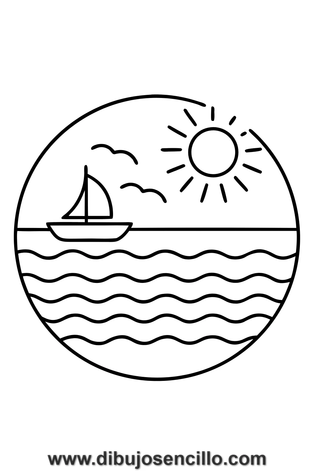 Un paisaje marino completo y sereno con el sol brillando sobre el horizonte, las olas en movimiento y un velero navegando a lo lejos. Esta escena clásica del mar captura toda la paz y belleza del océano con apenas unas pocas líneas onduladas y formas básicas.
