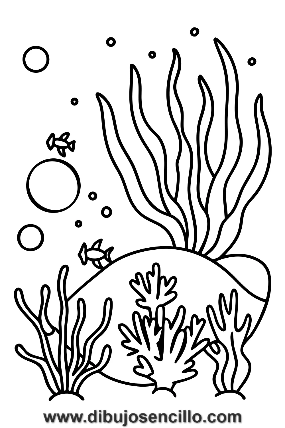 El fondo del mar enseña a crear composiciones con múltiples elementos de diferentes formas y alturas para lograr profundidad y riqueza visual. Es el dibujo marino más completo para principiantes porque combina todos los elementos del océano en una sola escena acogedora.