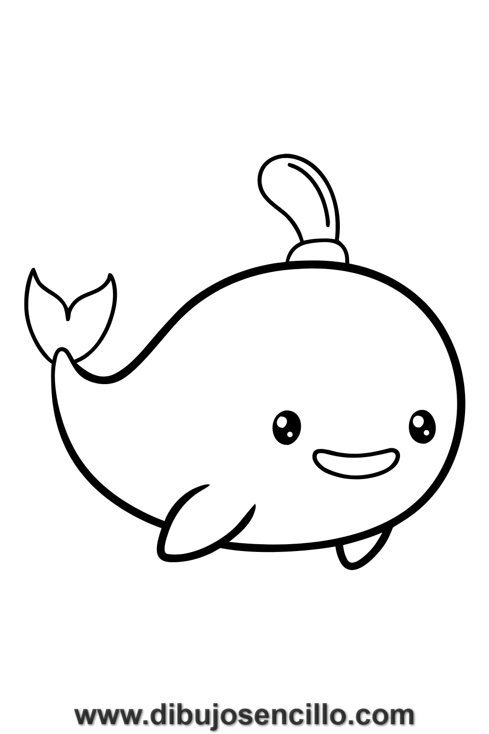 La ballena kawaii enseña a trabajar con proporciones muy grandes usando el óvalo como forma dominante de la composición. Es uno de los animales marinos más queridos para dibujar por su tamaño imponente simplificado en formas suaves y redondeadas.