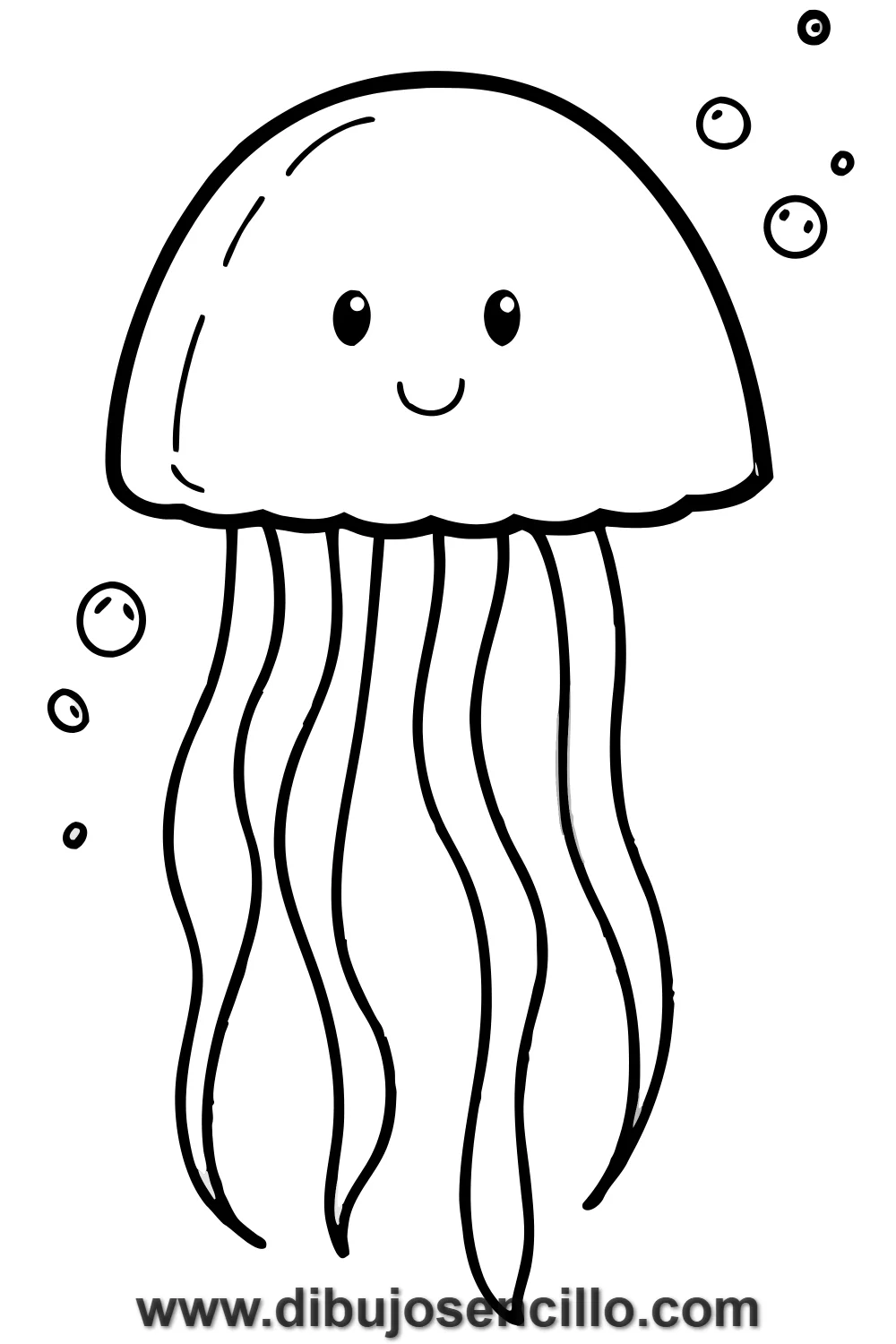 Una medusa etérea y misteriosa flotando libremente en las corrientes del océano, con su campana semitransparente y sus tentáculos ondulantes que se mueven con la marea. Su forma simple y su movimiento fluido la convierten en una de las criaturas marinas más hipnóticas de dibujar.