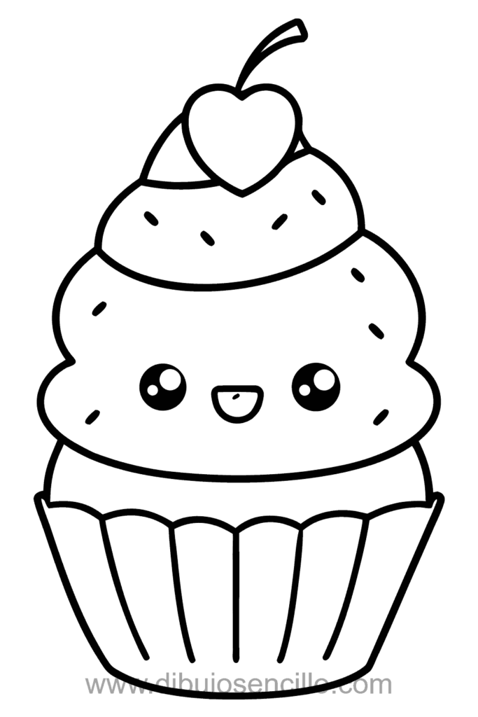 El estilo kawaii hace que este cupcake sea dulce y fácil. Es ideal para practicar espirales simples y formas trapezoidales básicas.