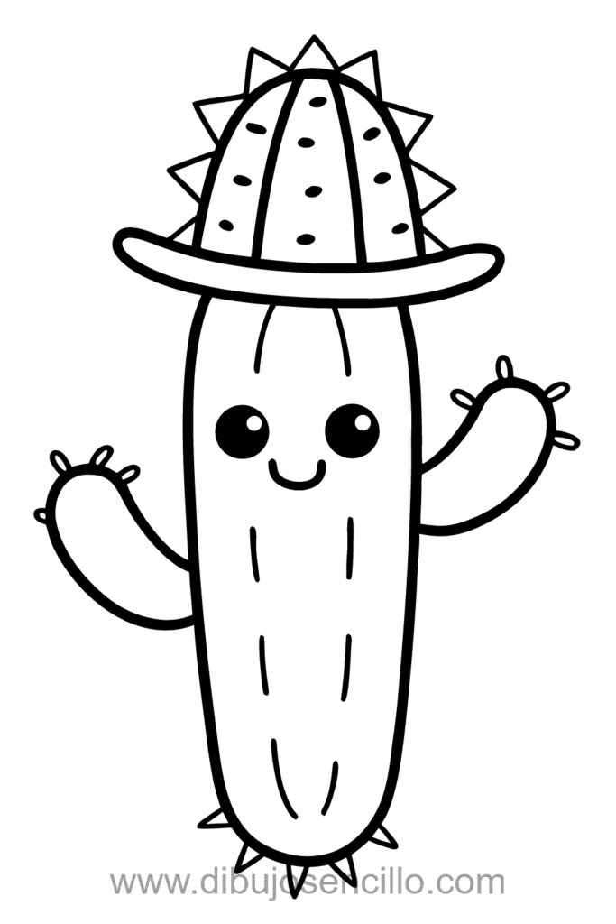 El estilo kawaii hace que este cactus sea divertido y simple. Es ideal para practicar óvalos verticales y añadir accesorios culturales.
