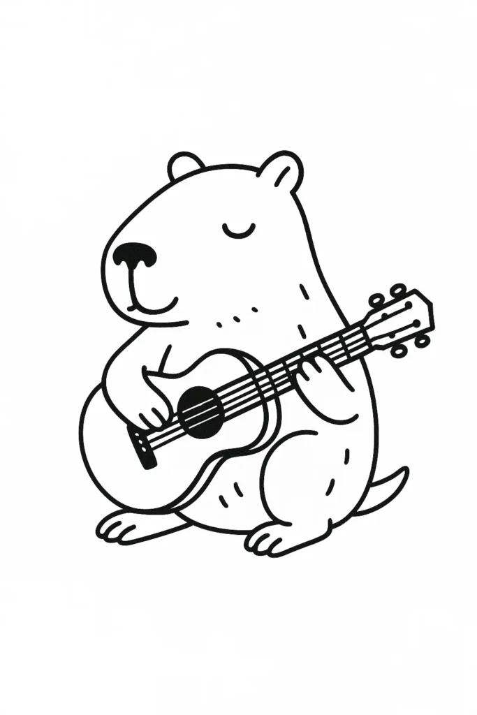 Un capibara talentoso tocando una pequeña guitarra acústica con una sonrisa radiante de felicidad. Las notas musicales flotando alrededor transmiten la melodía alegre que está creando. Los pequeños parlantes y corazones enfatizan su pasión por la música.