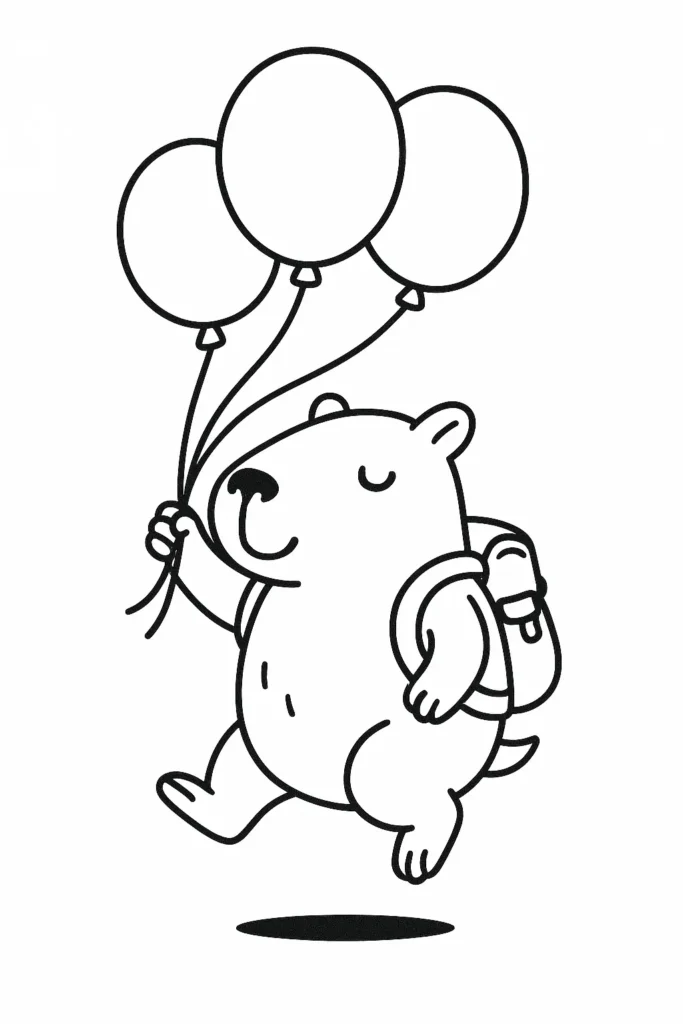 Este capibara festivo está sosteniendo varios globos coloridos con las cuerdas en sus patitas. Su expresión emocionada con ojos grandes muestra pura alegría y celebración. Las pequeñas nubes alrededor de los globos flotantes añaden profundidad y movimiento al cielo.