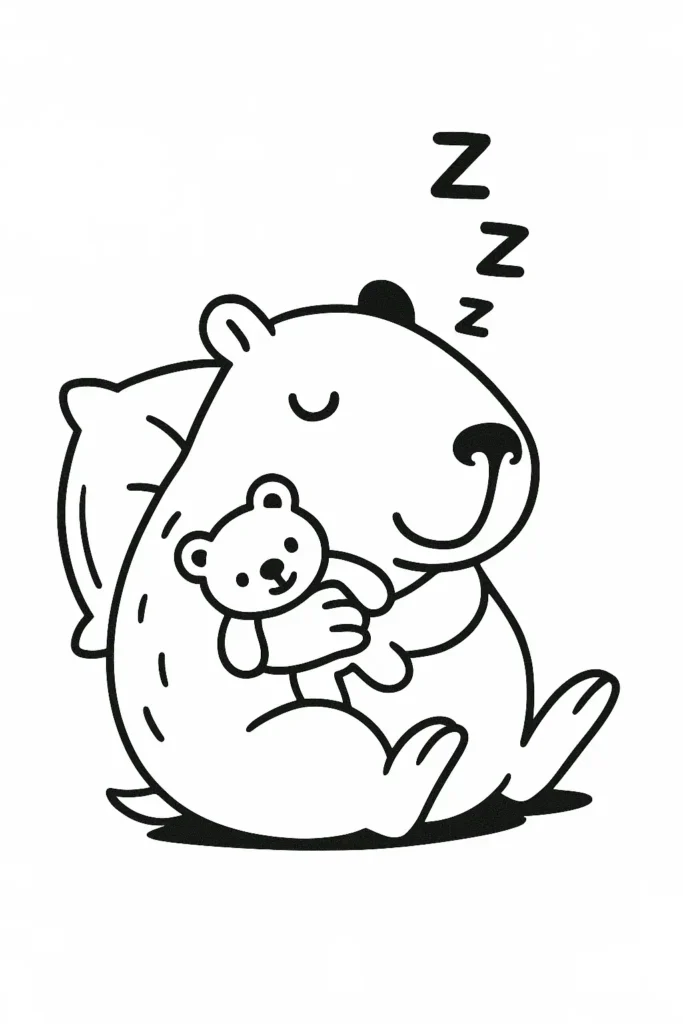 Un capibara tierno durmiendo profundamente mientras abraza un osito de peluche marrón contra su pecho. Las letras «Z» flotantes y su expresión suave transmiten un sueño tranquilo y reparador. La almohada y cobija añaden comodidad extra a la escena nocturna.