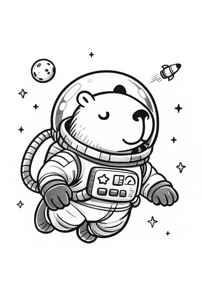 Un capibara espacial flotando en el cosmos dentro de un traje de astronauta blanco completo con casco redondo. Su expresión feliz visible a través del casco transparente muestra su emoción por la aventura espacial. Las estrellas, planetas y luna alrededor crean un ambiente galáctico fascinante.
