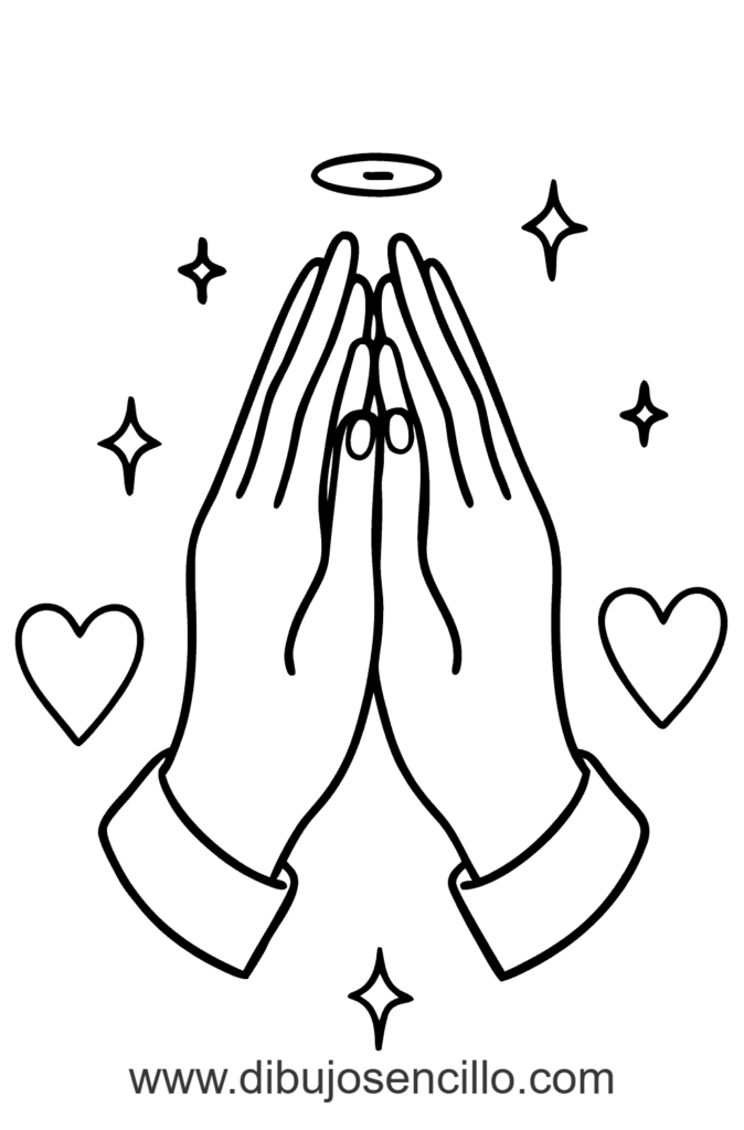Dos manos juntas presionadas palma con palma en posición de oración o namaste. Los dedos apuntando hacia arriba y formas suaves transmiten paz y espiritualidad. Las pequeñas alas de ángel y halo refuerzan el mensaje de esperanza y fe.