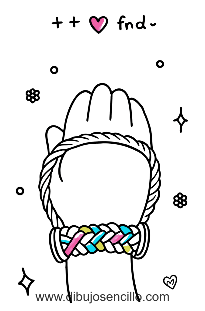 Una mano relajada mostrando una pulsera de amistad colorida tejida alrededor de la muñeca. Los dedos en posición natural y curva permiten ver claramente el accesorio especial. Los corazones y símbolos de amistad celebran los lazos especiales entre amigos.