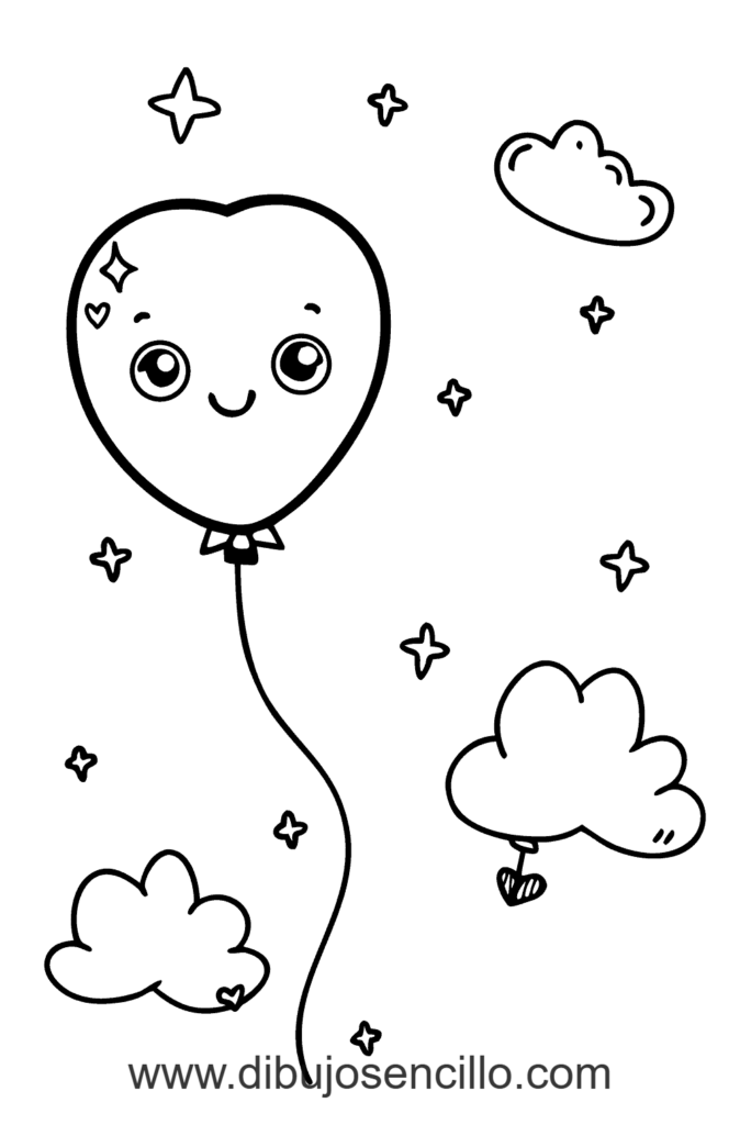 Una mano sosteniendo delicadamente el hilo de un globo flotante en forma de corazón. El agarre suave con dedos redondeados muestra cuidado para no soltar el globo. Las nubes y globos adicionales crean una atmósfera festiva y ligera.
