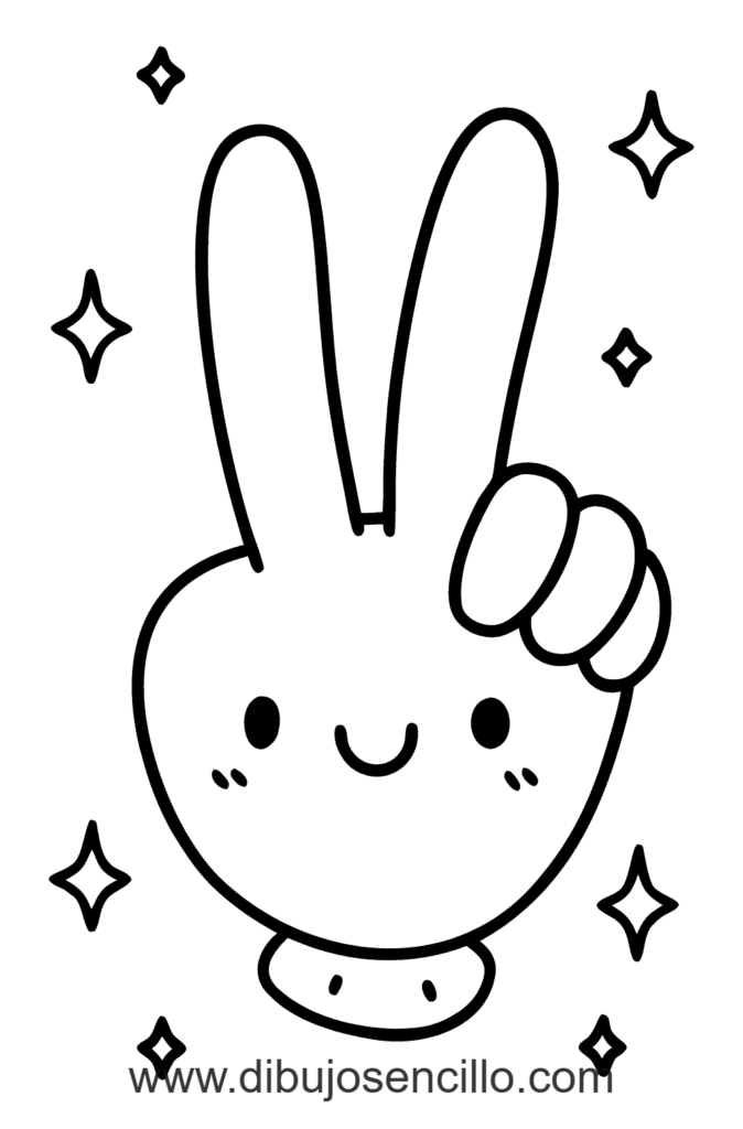 Una mano amigable haciendo la clásica señal de paz con dos dedos extendidos en forma de «V». Los dedos redondeados y las formas simples hacen que este gesto icónico sea fácil de dibujar. Las estrellitas y caritas sonrientes alrededor transmiten positividad y buenas vibras.