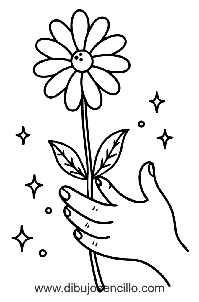 Una mano delicada sosteniendo suavemente una flor simple por el tallo con los dedos curvados naturalmente. La palma abierta muestra cuidado y gentileza al sostener la flor. Los pétalos cayendo y destellos alrededor crean una atmósfera romántica y primaveral.
