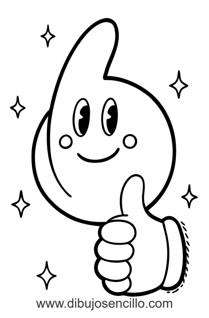 Una mano formando un puño con el pulgar extendido hacia arriba en señal de aprobación. Las formas redondeadas y proporciones amigables hacen que este gesto positivo sea fácil de dibujar. Las caritas sonrientes y marcas de aprobación refuerzan el mensaje optimista.