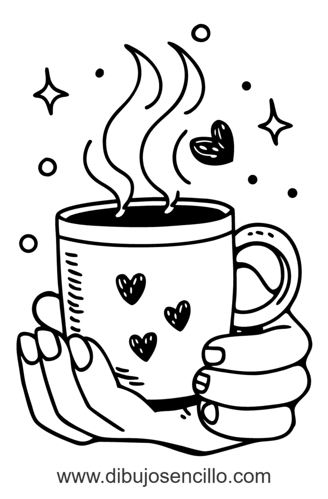 Una mano envolviendo cómodamente una taza caliente de café con los dedos curvados alrededor del recipiente. El vapor que se eleva de la taza sugiere calidez y confort. Los granos de café y corazones alrededor crean una atmósfera acogedora y matutina.