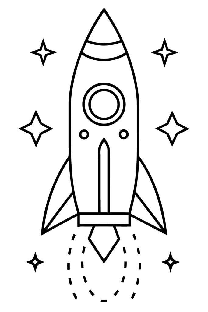 El estilo minimalista hace que este cohete sea dinámico y fácil. Es perfecto para practicar triángulos alargados y añadir elementos espaciales.