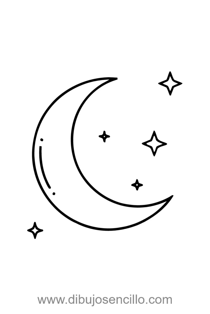 Una luna creciente usando curvas paralelas simples con estrellas pequeñas. Las formas de arco limpias crean símbolo nocturno sereno elegante.