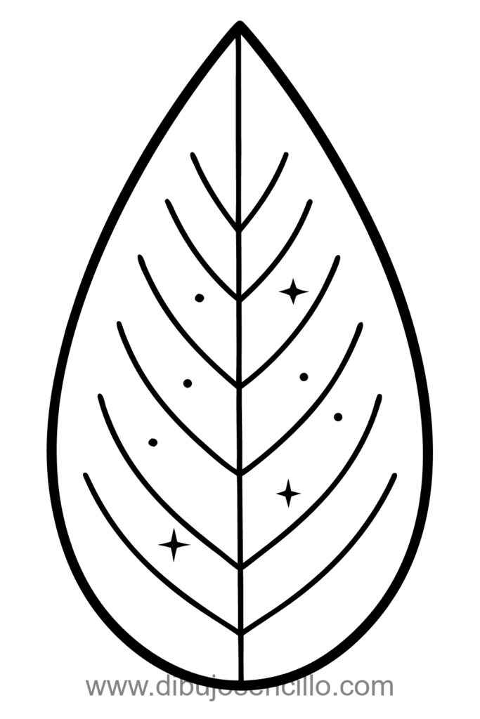 Una hoja usando óvalo simple con línea central como vena principal. El tallo pequeño y forma natural crean elemento botánico básico.