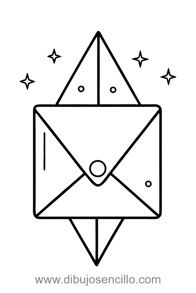 Un sobre usando rectángulo base con triángulo superior como solapa. El sello pequeño y líneas decorativas crean símbolo postal clásico.